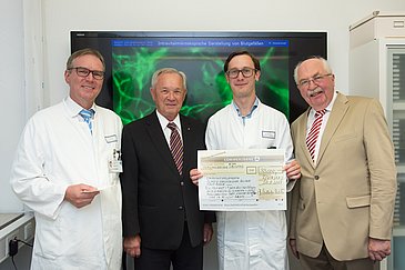 Dr. Wilhelm Polster, Vorstand der Manfred-Roth-Stiftung, tat bei der Scheckübergabe seine Bewunderung für die Forschungsarbeit der Plastischen Chirurgie kund: "Ihren Förderantrag habe ich mit großem Interesse gelesen und er hat mich überzeugt. Solche Vorhaben bringe ich gerne in den Stiftungsvorstand ein." Heute konnte er sich nun selbst ein Bild von der fluoreszenzgestützten Intravitalmikroskopie machen und die speziell für die Erlanger Forscher hergestellte Titan-Beobachtungskammer in die Hand nehmen.