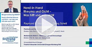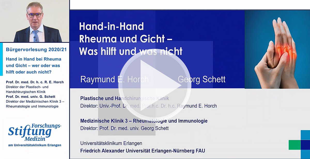 Die beiden Rheumaexperten Prof. Schett und Prof. Horch gaben in ihrer gemeinsamen Bürgervorlesung „Hand in Hand bei Rheuma und Gicht – wer oder was hilft oder auch nicht“ Antworten auf diese und weitere Fragen rund um Rheuma- und Gichterkrankungen der Hand. Das Bild rechts führt direkt zur Aufzeichnung des Bürgervortrags im Medienportal der FAU.